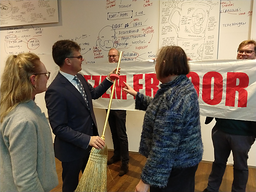 De nieuwe commissaris van de koning Hans Oosters heeft bij zijn installatie een gouden bezem gekregen uit handen van fractievoorzitter Andrea Poppe van de SP. Tegelijkertijd ontvouwden enkele partijgenoten een spandoek met de tekst ‘Bezem erdoor’. Een symbolische actie van de SP als aanmoediging om...