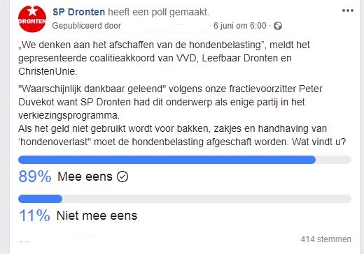 Negenentachtig procent van een goede 400 mensen op Facebook zegt: Weg met de hondenbelasting!! Maar de raad van Dronten zegt klip en klaar: "u betaalt maar lekker wat extra omdat u een hond heeft. Want dat is toevallig het enige dier waarover we belastinng kunnen heffen. Oh ja, maar we besteden het...